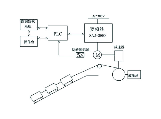 變頻器接入一制動(dòng)單元和制動(dòng)電阻,就可以滿足重車下行時(shí)的再生制動(dòng),實(shí)現(xiàn)平穩(wěn)的下行。井口還有一個(gè)液壓機(jī)械制動(dòng)器,類似電磁抱閘,此制動(dòng)器用于重車靜止時(shí)的制動(dòng),特別是重車停在斜井的斜坡上,必須有液壓機(jī)械制動(dòng)器制動(dòng)。液壓機(jī)械制動(dòng)器受PLC和變頻器共同控制,機(jī)械制動(dòng)是否制動(dòng)受變頻器頻率到達(dá)端口的控制,起動(dòng)時(shí)當(dāng)變頻器的輸出頻率達(dá)到設(shè)定值,例如0.2Hz,變頻器A、B端口輸出信號(hào),表示電機(jī)轉(zhuǎn)矩已足夠大,打開(kāi)液壓機(jī)械制動(dòng)器,重車可上行;減速過(guò)程中,當(dāng)變頻器的頻率下降到0.2Hz時(shí),表示電機(jī)轉(zhuǎn)矩已較小,液壓機(jī)械制動(dòng)器制動(dòng)停車。緊急情況時(shí),按下緊急停車按鈕,變頻器能耗制動(dòng)和液壓機(jī)械制動(dòng)器同時(shí)起作用,使提升機(jī)在盡量短的時(shí)間內(nèi)停車。