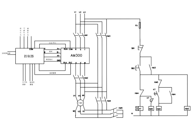 其中KM1、KM3為工變頻切換接觸器,控制器選用普勒特,變頻器選用安邦信AM300系列。變頻器與控制器的鏈接:R485通訊,開關(guān)量控制變頻器啟停,模擬信號控制變頻器速度,變頻器故障信號反饋等。